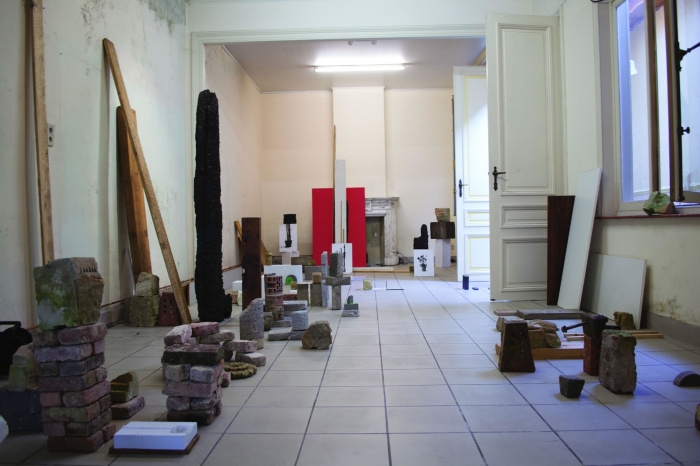 Un monde à la fois intime et utopique, tout en relevant des réalités incontournables de la sphère socio-politique au sens large. Cet Atelier parle du présent de Lessines, chaque élément de construction renvoie à un modèle imaginaire de la ville dans son rapport à l’histoire. L’Atelier comme le site idéal pour y mener des fouilles en vue de trouver de nouveaux aspects par la mise en relation. La sculpture est mise en relation pour faire jaillir d’elle-même quelque chose de nouveau. Ses sculptures sont dans une étroite relation spatiale, elles créent au sein de l’atelier des œuvres nouvelles, signifiant ainsi l’importance du lien des œuvres entre elles et les possibilités de mobilité de chacune au sein de l’ensemble. La notion d’Atelier ici « ouvert » est un laboratoire, un lieu de confrontation entre un ordre tracé par l’homme et le chaos. Entre discours et praxis, cet espace devient une expérience pour le regard sur la mise en relation entre les médiums. Des agencements de matériaux hétérogènes (dé)construisent le temps donné de l’Atelier.